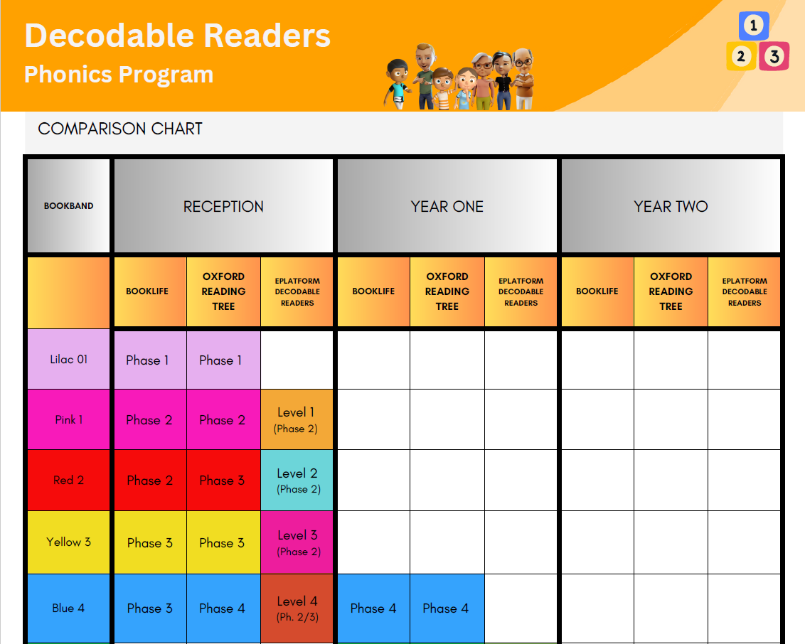 This chart aligns the Decodable Readers’ structured phonics scope and sequence levels with the corresponding levels in BookLife and Oxford Reading Tree publications.